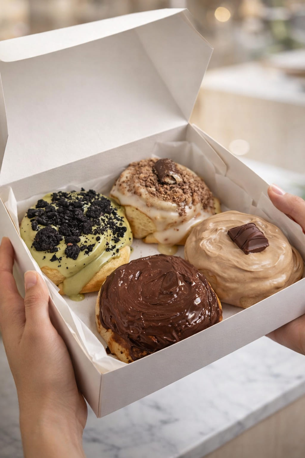 - Rolls calientes, esponjosos y con toppings que se derriten desde el primer bocado